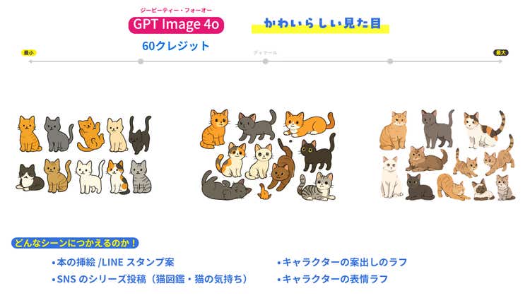 続けてパートナーモデルの生成例を紹介します。下は GPT Image 4o の出力です。1 回の生成で 60 クレジット消費します。かわいらしい見た目になるのが特徴で、ややオレンジが強く出る傾向があるようです。サードパーティ製の生成 AI モデルながら、ちゃんと「ディテール」の指定が効いています。