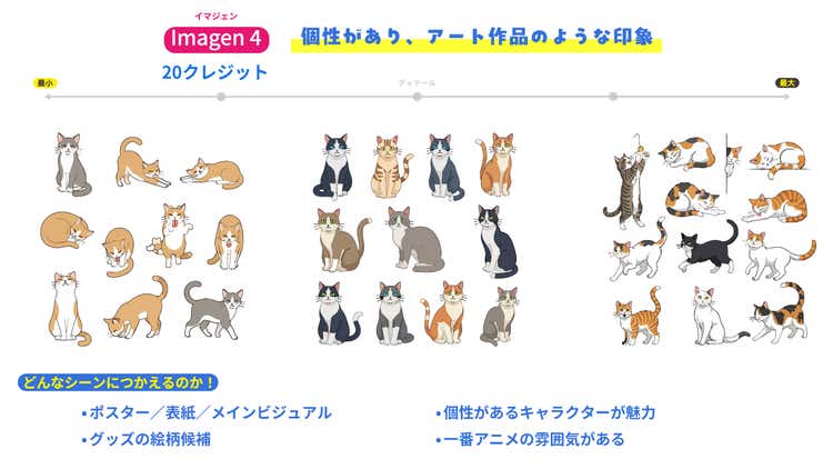 Imagen 4 が生成した画像は以下の通りです。1 回の生成で 20 クレジット消費されます。絵に個性があり、アニメ作品に登場しそうな猫の雰囲気を感じられます。