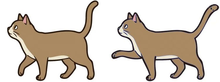 生成された猫のポーズを変えたいときは、「パペットワープツール」が便利です。変形するアートワークを選択し、ツールパネルのパペットワープ ツールをクリックすると、アートワークに 3 つ以上のピンが表示されます。ピンを選択してドラッグすると、猫のポーズを変えられます。