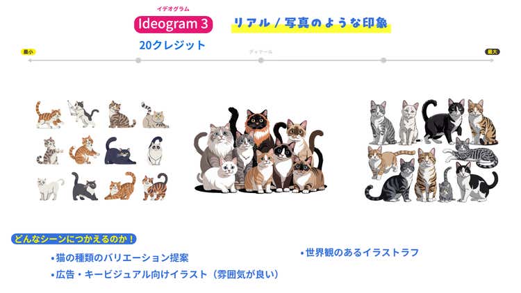 Ideogram 3 では下のような画像が生成されました。このモデルは 1 回の生成で 20 クレジット消費します。リアルな印象の猫が生成されており、猫の種類が豊富です。中央の画像は猫の集合写真のような生成結果になりました。