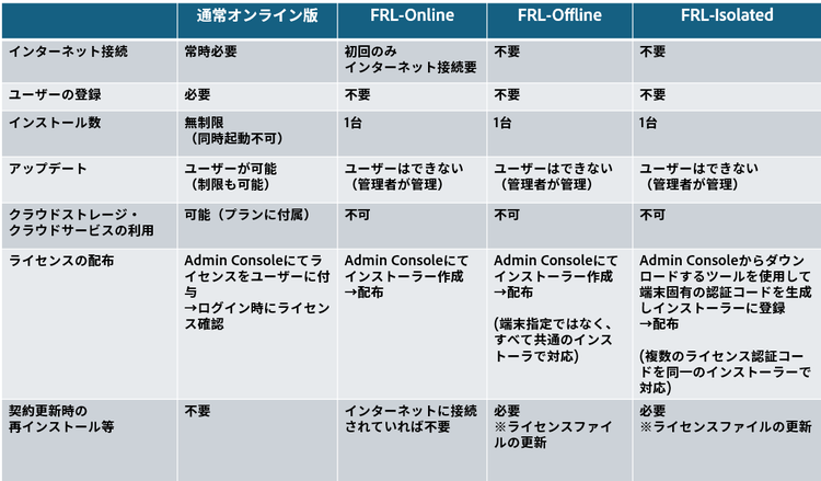 また、オンライン版ライセンスとオフライン版ライセンスの違いが一目で分かる下記の比較表もご参照ください。
