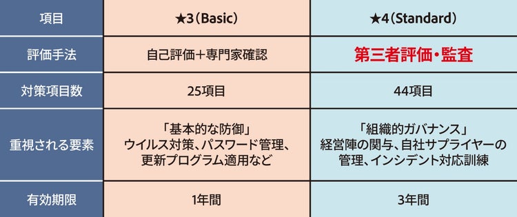 - ★3(Basic)と★4(Standard)の違い: 基礎的な防御(★3)から、組織的なガバナンスと包括的な対策(★4)へのステップアップ。