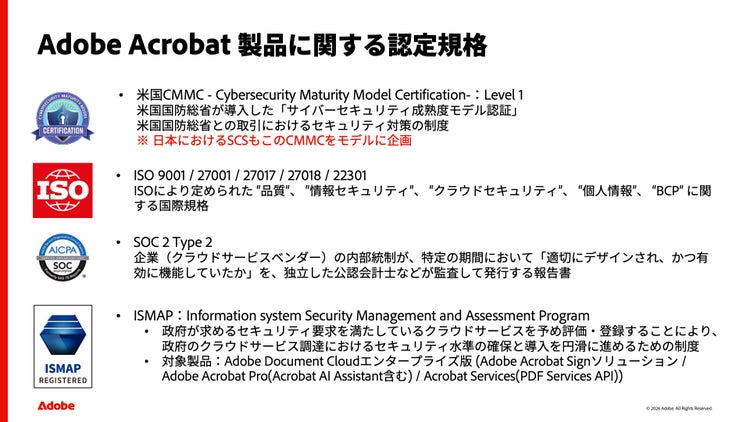 - 政府調達基準のクリア: Adobe Document Cloudは「政府情報システムのためのセキュリティ評価制度(ISMAP)」に登録済み。