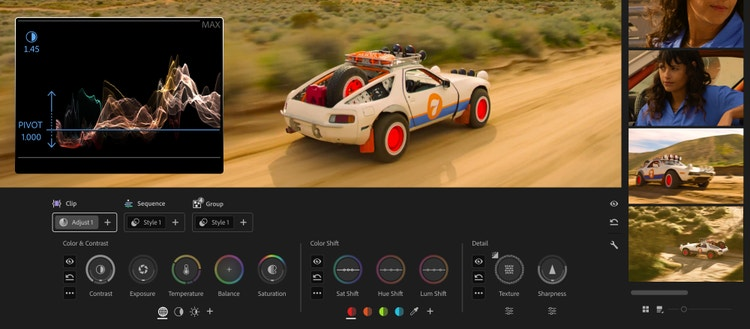 カラーモードでは、映像が常に最優先されます。期待通りに反応するインターフェイスと、やりたいことが高度化すればそれにも応えてくれるシステムを提供します。ちょっとした調整をしたい場合でも、フッテージを深く掘り下げたい場合でも、カラーモードはユーザーのニーズに応えます。カラーモードを使用した編集者からは、この新しい体験によってカラーグレーディングが楽しいものになったという声が寄せられています。クリエイティブな決定一つひとつに専門的知識を要求するのではなく、好奇心、実験、そして遊び心を誘う体験となっています。