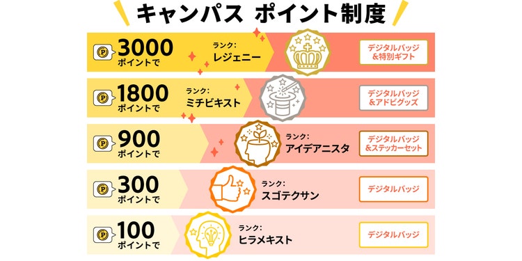 キャンパス内で投稿をしたり、他のカレッジ生の投稿にコメントをしたり、スタンプなどのリアクションを送ったりすることで、自動的にポイントが付与されます。そして、ポイントが一定数貯まるとランクが付与され、ランクに応じた認定デジタルバッジや、オリジナルグッズを受け取ることができます。