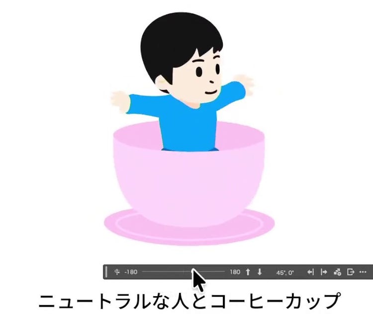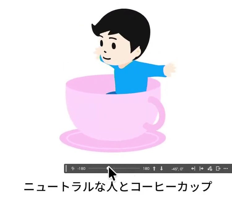 回転の軸が分かりやすくて描写の単純なイラストは、回転させたときに破城しにくい傾向があります。下の例では、コーヒーカップと人を回転させてみましたが、違和感のないビューが生成されています。