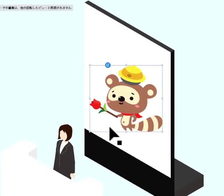 下のような使い方もできます。ここでは、イラストを「ターンテーブル」で回転してから、角度と透明度を設定してアイソメトリックなシーン内に配置しています。