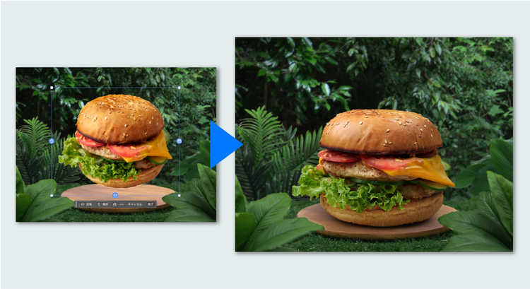これまで、被写体やパーツの角度を変更するには、変形や再配置、場合によっては素材の再作成など、複数の工程が必要でした。この新機能では、元の画像データを活かしたまま、オブジェクトを自然な形で回転・傾斜させ、別の視点から再構成することが可能になります。