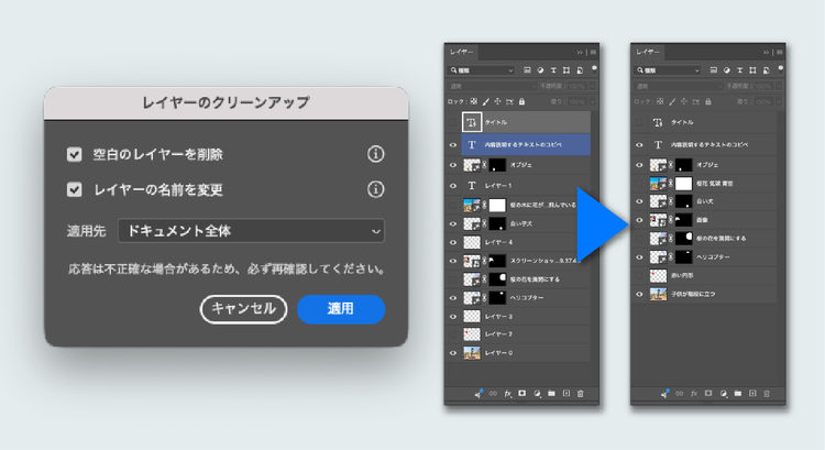 レイヤー名の自動整理や不要レイヤーの削除により、ファイルの見通しが改善され、チーム制作や長期プロジェクトでも扱いやすい状態を保てます。