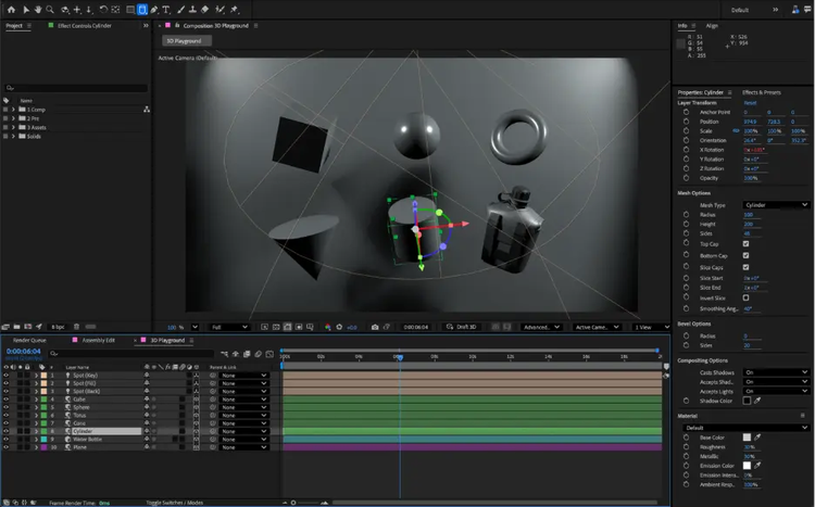 애프터 이펙트 안에서 처음부터 직접 생성한 파라메트릭 망으로 3D 디자인을 구현할 수 있습니다. 큐브, 구, 실린더, 콘, 토러스, 평면 등 다양한 형태를 만들고 자유롭게 커스터마이징할 수 있으며 블록을 쌓듯 형태를 조합해 스타일리시한 그래픽부터 사실적인 세트 연출까지 완성할 수 있습니다. 또한 새롭게 추가된 스폿(Spot) 그림자와 평행(Parallel) 그림자는 장면의 역동성과 현실감을 한층 더 높여줍니다.
