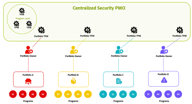 At Adobe, our centralized security PMO is directly embedded within the security organization, bringing together TPMs who execute individual programs and senior portfolio TPMs who provide strategic oversight across entire security domains using a portfolio-based approach.